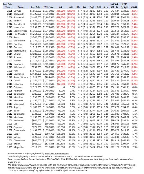 It is challenging to compare home prices from one year to the next because the inventory is different. This chart eliminates the challenge – it represents those homes that sold in 2019 and also sold in the last 20 years and, did not appear, based on their listings, to have material renovations inside or out enabling a like-for-like comparison. Note, I have only included the street name, not the number, in order to be sensitive to current and prior owners. Also note that while there are some clear trends that will likely not be surprising to you, this data cannot predict future sale prices.