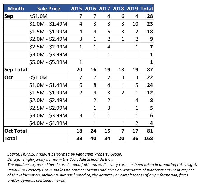 Compared to the slow market in Sept and Oct of 2018 (20 sales), sales during the same period in 2019 have just about returned to their historical norm with 36 sales, up 80% vs. last year.